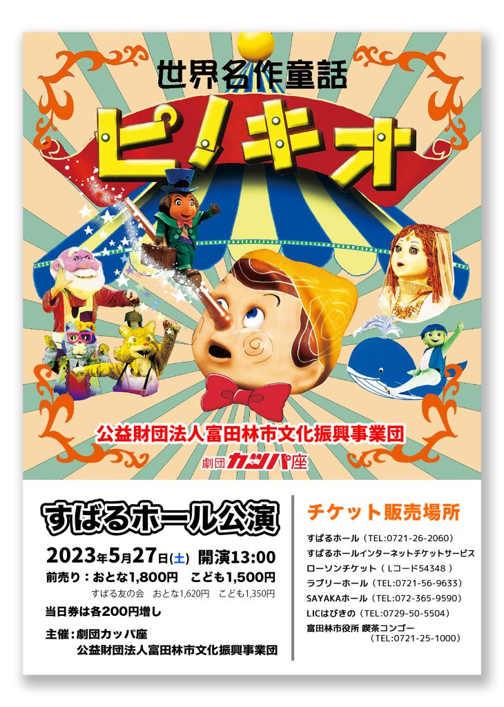 ピノキオ(すばるホール公演) 投稿日 2023年5月12日 更新日 2025年2月15日 著者 kappaza2021 カテゴリー 公演情報 誰もが知る世界名作童話「ピノキオ」子供達に豊かな文化活動に触れてもらうためすばるホールとカッパ座がタックを組む公演です。 チケットはすばるホールを初めラブリーホール、SAYAKAホール、LICはびきの富田林市役所 喫茶コンゴーで購入できます。 その他インターネットでも購入可能です。 すばるホール ローソンチケット シェア ツイート ブックマーク Feedly LINE ピノキオ、カッパ座、カフェ、人形劇、童話、すばるホール