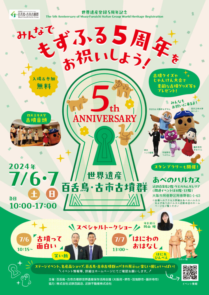 もずふる5周年をお祝いしよう 投稿日 2024年6月21日 更新日 2024年6月26日 著者 kappaza2021 カテゴリー イベント 7月6日(土)-7日(日)あべのハルカス近鉄百貨店2階ウェルカムガレリアにおいて百舌鳥・古市古墳群世界遺産登録5周年の記念イベントが開催されます。7月7日(日)の13:00からはカッパ座のはに丸・ひん兵が出演させていただきます。ぜひ、遊びにきてくださいね。 シェア ツイート ブックマーク Feedly LINE